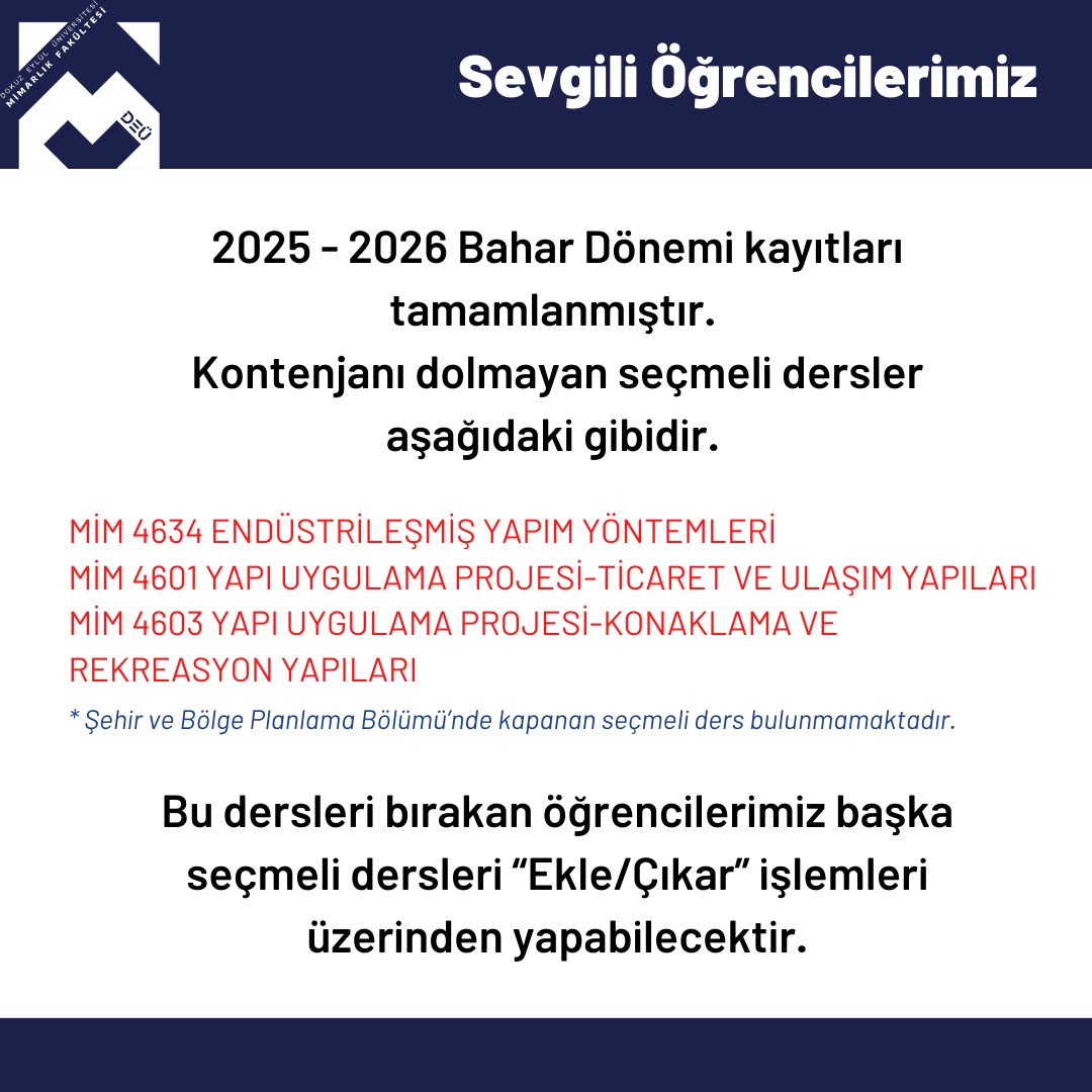 2025-26 Bahar Yarıyılı Kapanan Seçmeli Dersler ve Ders Ekle/Çıkar İşlemleri Duyurusu